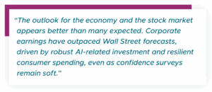 The outlook for the economy and the stock market appears better than many expected. Corporate earnings have outpaced Wall Street forecasts, driven by robust AI-related investment and resilient consumer spending, even as confidence surveys remain soft. The impact of tariffs, the big concern earlier this year, has also been quite muted, as companies have found ways to mitigate their impact on both demand and profitability. ISM surveys also show a continued expansionary services economy, albeit a still sluggish manufacturing economy. Lastly, the Fed has finally resumed its path of rate cuts in September, expected to aid in economic growth, with several more cuts expected later this year and into next. The sluggish labor market and somewhat sticky inflation remain the primary fears of market pundits, although neither is yet deteriorating in a manner that would derail the economy.