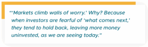 The stock market continues to rise in spite of the steady stream of negative headlines around presidential policies. Maybe, just maybe, it is rising because of all that press? An old adage is proving true: “Markets climb walls of worry.” Why? Because when investors are fearful of “what comes next,” they tend to hold back, leaving more money uninvested, as we are seeing today.
