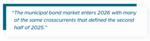 The municipal bond market enters 2026 with many of the same crosscurrents that defined the second half of 2025. Supply is expected to remain elevated as issuers continue to address deferred capital needs and higher project costs, while broader rate direction remains in flux. Investors are balancing expectations for further policy easing against lingering questions around growth, inflation, and fiscal policy. Despite those uncertainties, demand for tax-exempt bonds remains well supported by attractive tax-equivalent yields and solid trailing performance, a combination that usually provides a powerful tailwind in a retail-driven asset class. Credit conditions also remain constructive, even as revenue growth normalizes from the unusually strong post-pandemic period. Taken together, a shifting rate environment, heavy supply, and solid underlying fundamentals should continue to create opportunities for active managers to add value through security selection and relative value trading in the year ahead.