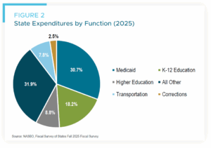 This spending trend comes at a time when federal policies could affect certain states. For example, tariffs may disproportionately harm economies with substantial trade and manufacturing while recent FEMA aid delays and denials suggest states more prone to natural disasters might increasingly rely on their own funds for relief. Medicaid, which comprises over 30% of budgets, is another pressure. This expense has climbed sharply over the last three years due to higher medical costs, elevated enrollment, and reduced pandemic-era federal assistance. While some states have revised their Medicaid programs to curb this growth, additional action will likely be needed given the recent reconciliation bill, which projects a 14% cut in federal Medicaid spending over the next 10 years. This mainly affects expansion states, though with most reductions starting in 2027 or later, budget officers have some time to address the funding gap. Even so, states may need to choose between lowering benefits or using their own resources to sustain them.