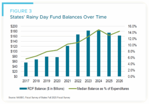 Should these or other issues create fiscal challenges, we believe most states are well prepared. There are 31 states that project RDF increases for fiscal 2026, with the median balance rising modestly to 14.4% of expenditures. This amount is well above historical standards and the second highest ever recorded by NASBO. It’s important to recognize the states’ efforts to preserve these balances over the last few years, having exercised the fiscal discipline to amass these reserves without applying them to recurring operations.