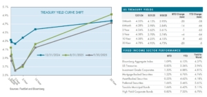 • High yield (HY) bonds lagged but still logged their fifth straight month of gains on the back of modest spread tightening. Finishing at 267 OAS, spreads are not far from last November’s low of 253 bps. September was the third busiest month of all time in the HY sector, as the primary market was ripe for refinance opportunities.